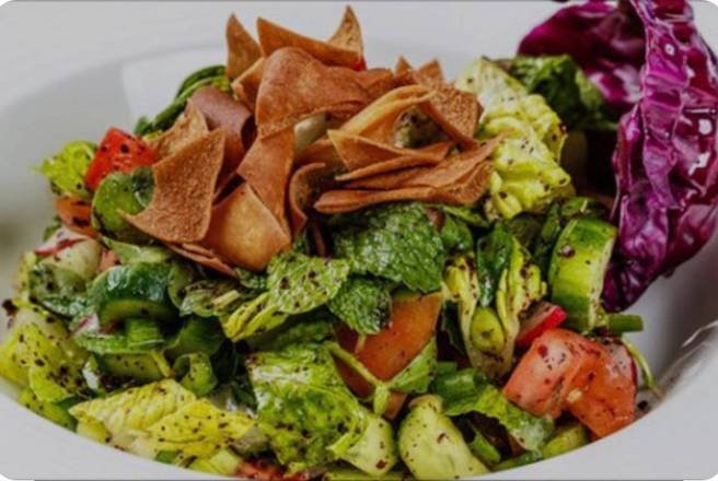 Lettuce, tomato, onion, cucumber, parsley, mint, red cabbage, with a lemony dressing topped with crunchy pita chips