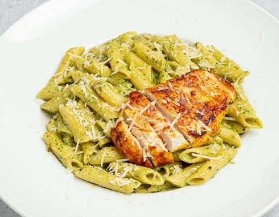 Penne noodles and Chicken cooked in a Creamy and pesto sauce topped with Parmesan cheese.